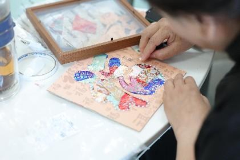 在制作环节,大家全神贯注、各展巧思。从挑选色彩斑斓的宋锦面料,到精心裁剪、拼贴出 “福” 字、葫芦、骏马等寓意吉祥的图案轮廓;从细致地粘贴珍珠作为点缀,到耐心地调整每一块锦缎的位置与角度,每一步都凝聚着匠心与巧思。
